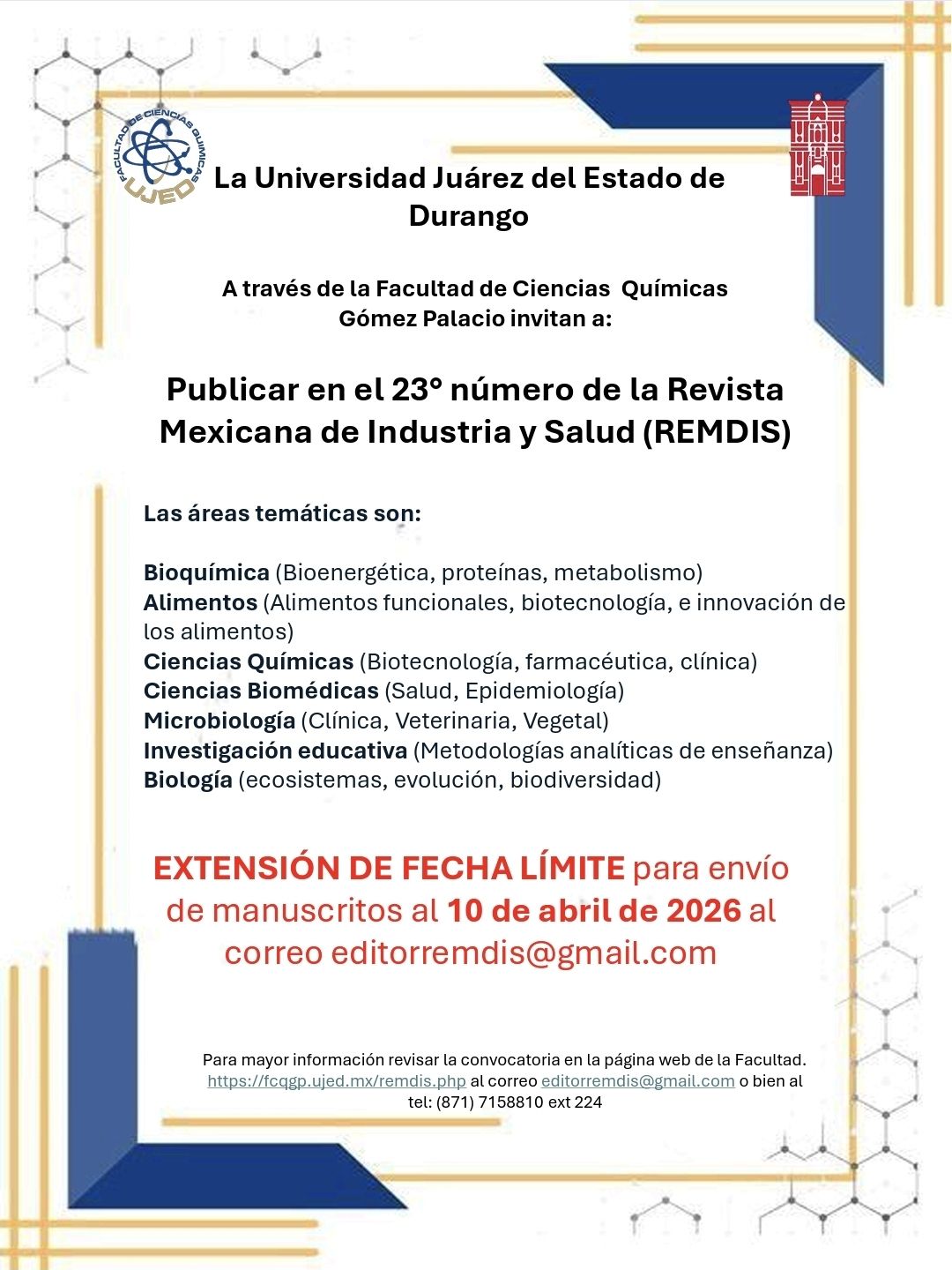 Revista Mexicana de Industria y Salud (mayo - octubre), es una publicación semestral editada por la Universidad Juárez del Estado de Durango a través de la Facultad de Ciencias Químicas Gómez Palacio ubicada en Av. Artículo 123 S/N Colonia Filadelfia Gómez Palacio, Durango. C.P. 35010. Tel (871) 715 8810 ext. 118, www.fcqgp.ujed.mx/remdis, editorremdis@gmail.com, simposiumfcqujed@gmail.com.